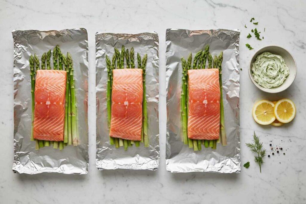 - Add Salmon: Place one salmon fillet directly on top of each bed of asparagus. Season the salmon generously with salt and pepper.
