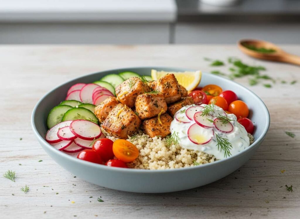 20-Minute High-Protein Salmon Souvlaki Bowls with Spring Tzatziki