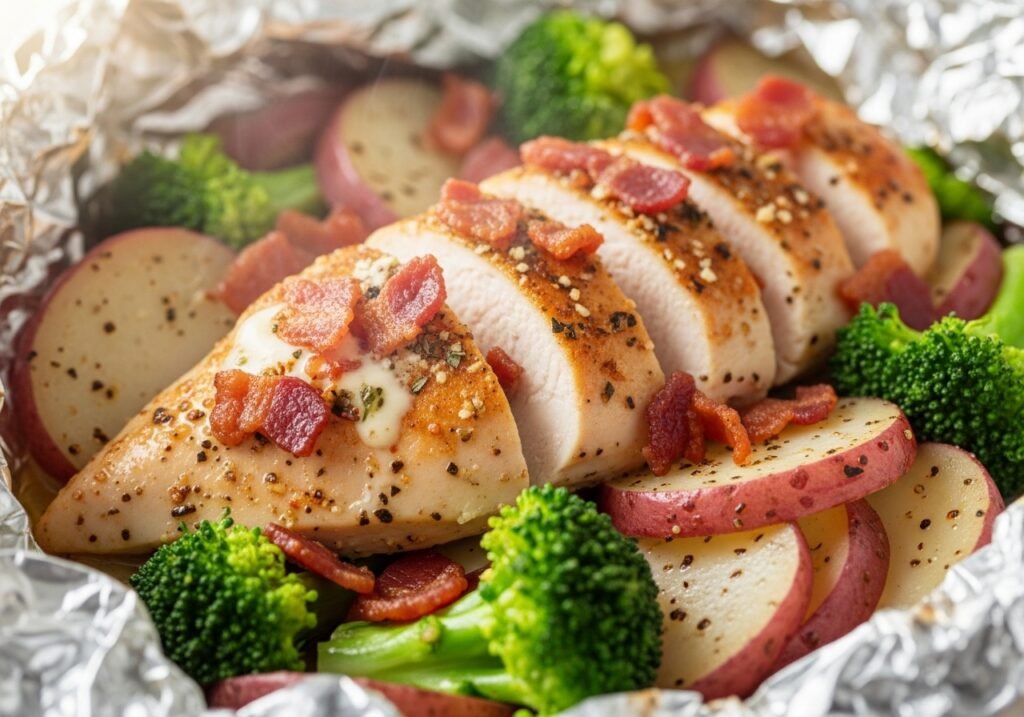 - Assemble the Packets: On each foil sheet, place a portion of the sliced potatoes and broccoli mixture in the center. Top the vegetables with one sliced chicken breast.