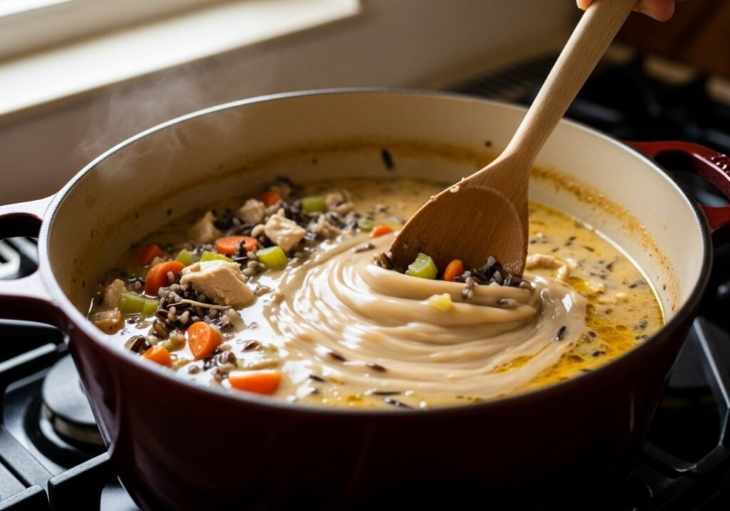 4. Add Chicken & Cream: Once the wild rice is cooked, stir in the 2 cups cooked chicken, 1 cup heavy cream, and 1/2 cup milk. Heat through gently for 5-10 minutes, ensuring the soup doesn’t come to a rolling boil after adding the cream (it can curdle).