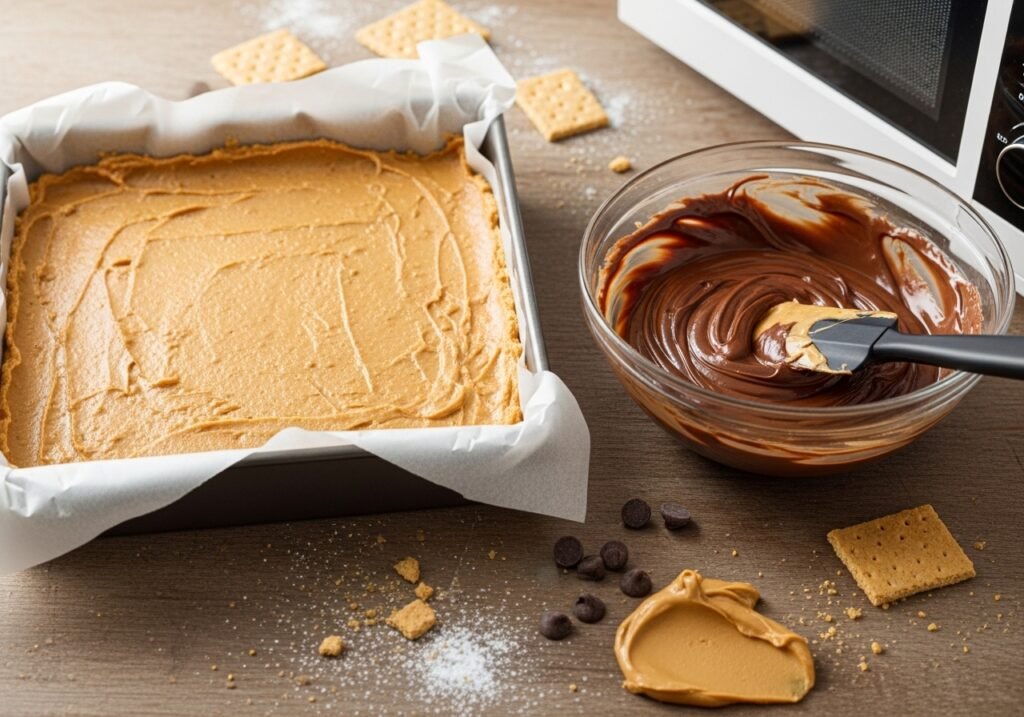 - Spread: Pour the melted chocolate mixture over the peanut butter base. Use a spatula to spread it to the edges in an even layer.