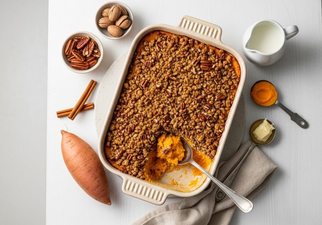 - Assemble & Bake: Sprinkle the pecan streusel topping evenly over the sweet potato base. Bake for 30–35 minutes, or until the topping is golden brown and the casserole is set.